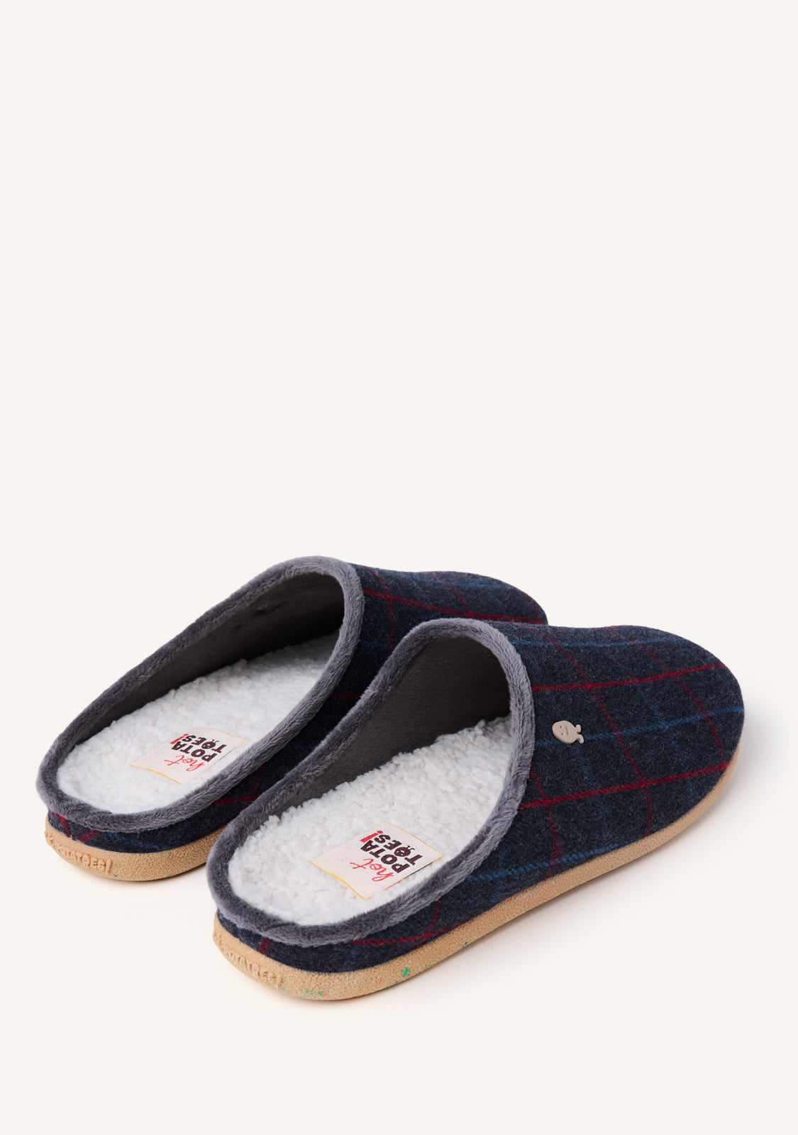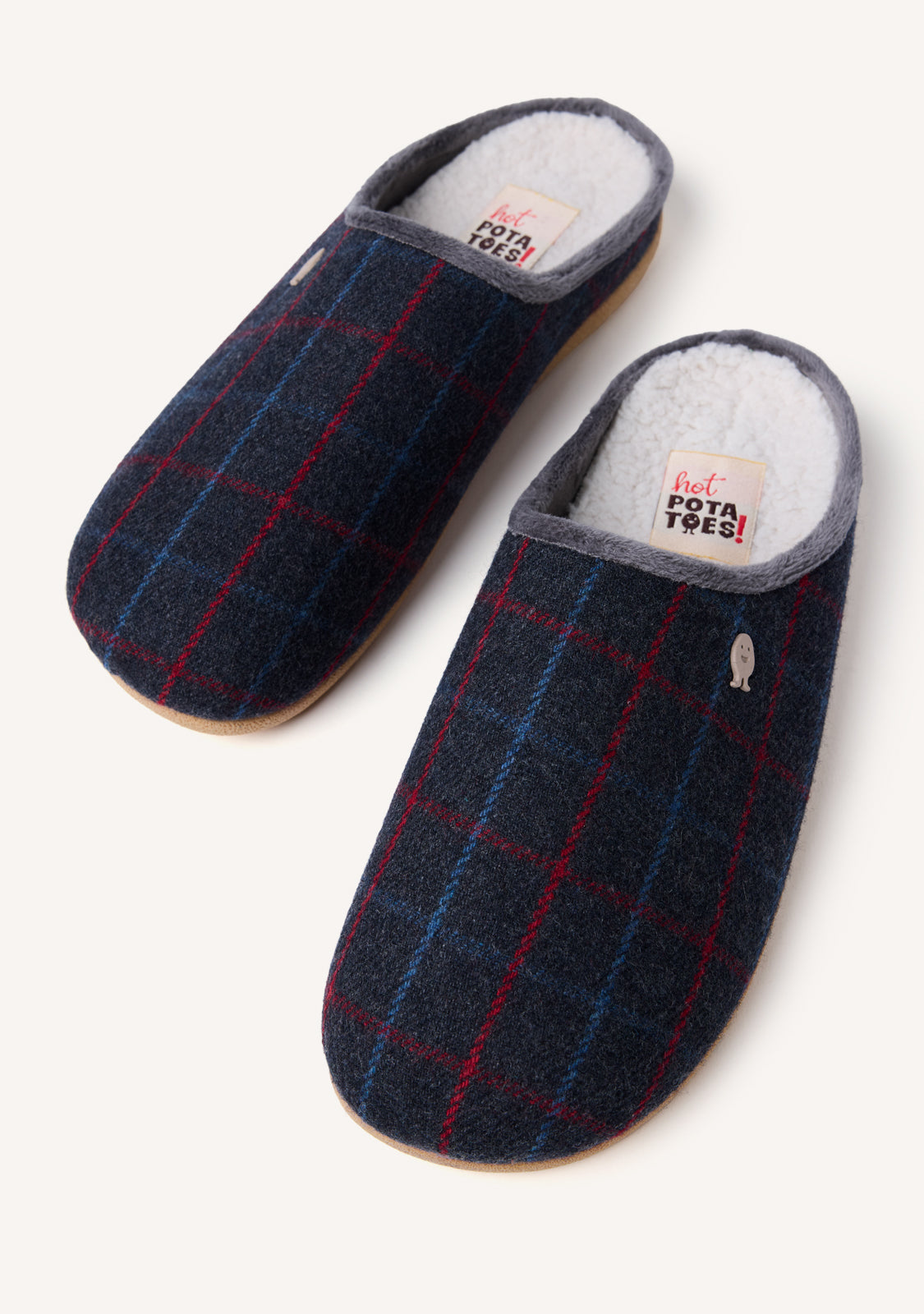 Comodidad para los momentos de descanso en el hogar. Zapatillas de estar por casa para hombre con diseño de cuadros en tonos sobrios, ideales para el día a día. Su interior de pelo aporta una sensación cálida y confortable, mientras que su diseño tipo mule facilita el calce y las hace prácticas y ligeras.