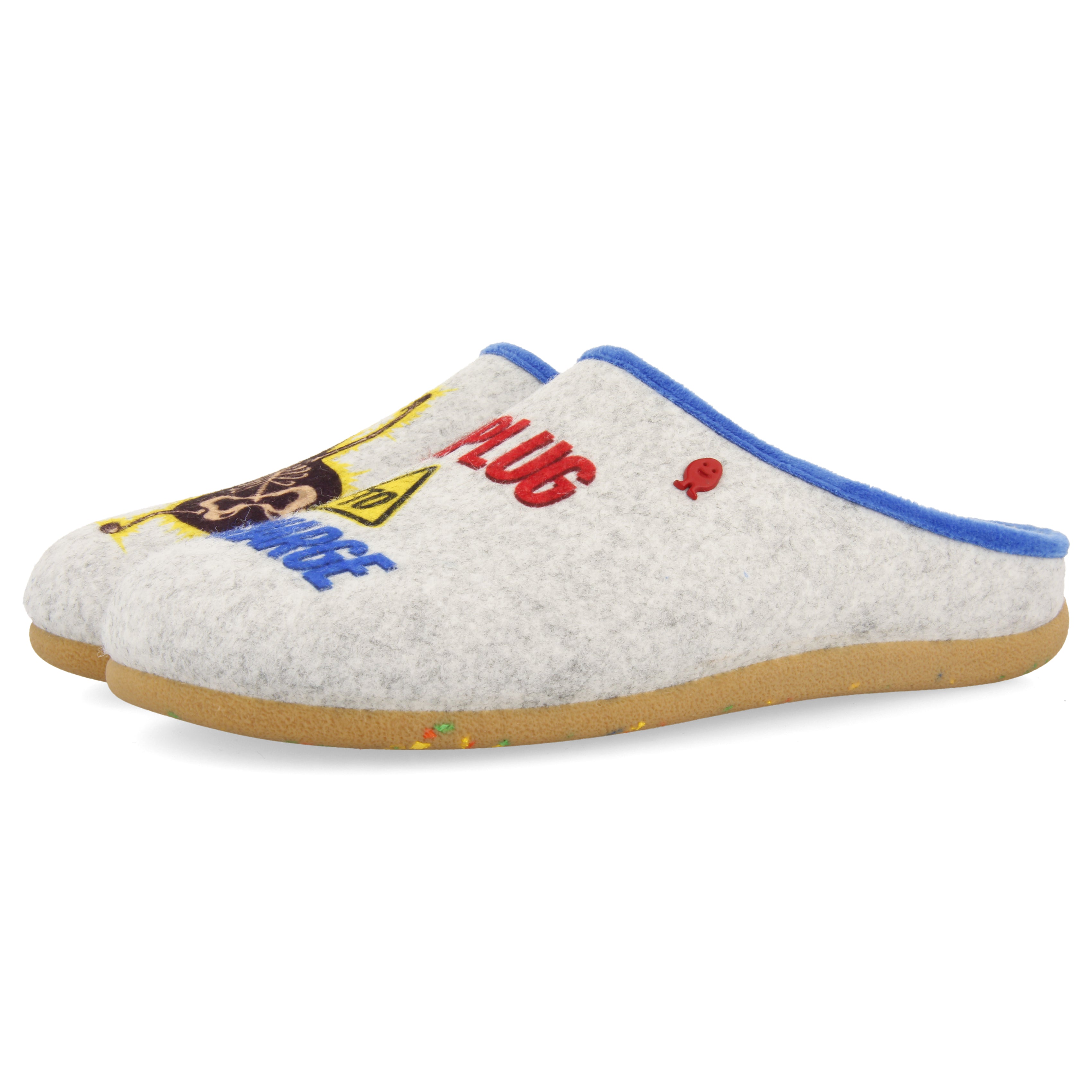 ¡Súper originales y molonas! Zapatillas de estar por casa tipo babucha color gris con nuestra patatilla en el mood Desenchufar para recargar pilas.EL corte es de fieltro PET reciclado. La planta y el ribete son de pelo muy suave. La plantilla es extraíble y de espuma de poliuretano 100% reciclado. La suela es de caucho natural en tono caramelo con virutas de colores de goma EVA.