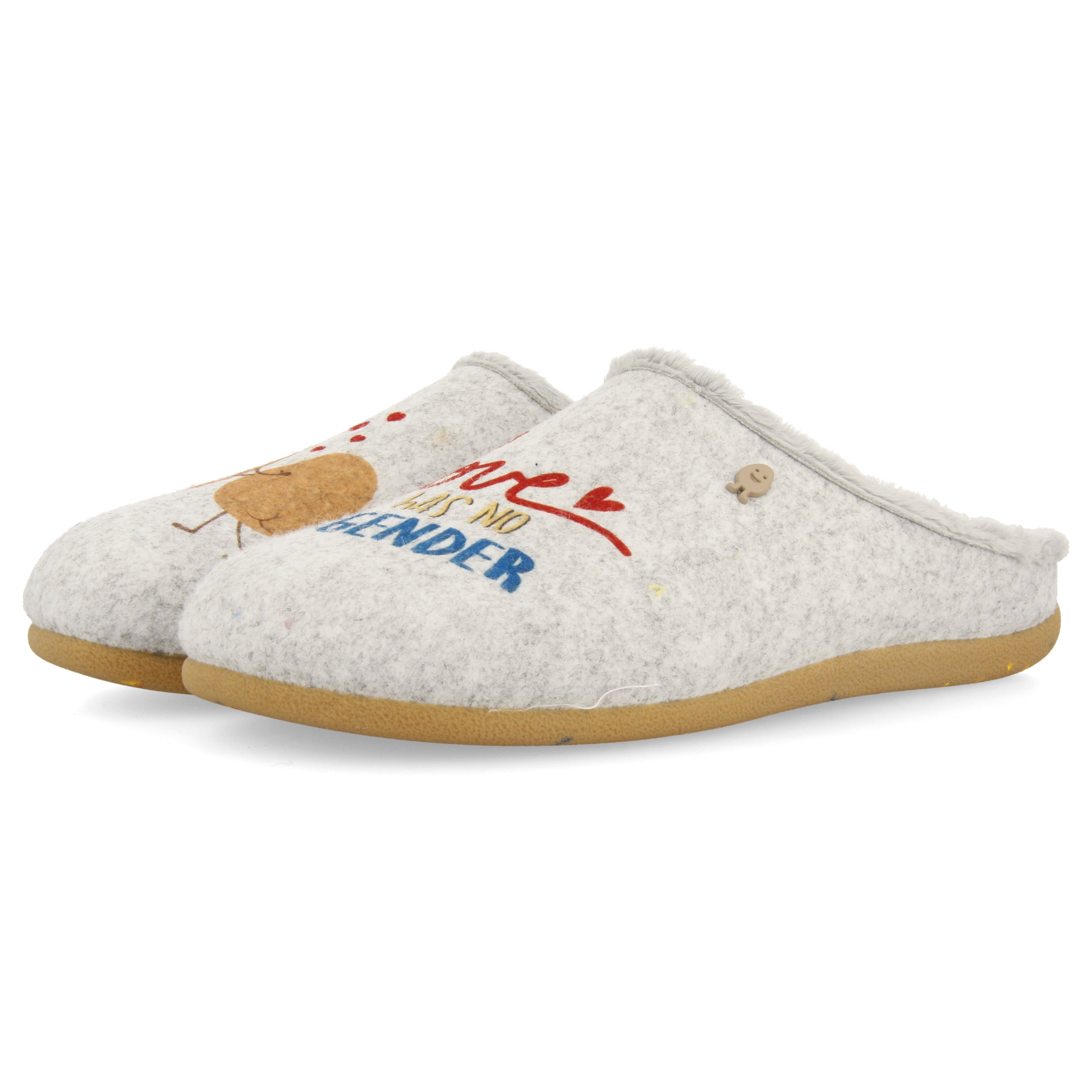 Descubre a nuestras nuevas patatillas. Zapatillas de estar por casa tipo babucha color gris con nuestra patatilla al estilo Love has no gender . EL corte es de fieltro PET reciclado. La planta es de borreguito muy suave. La plantilla es extraíble y de espuma de poliuretano 100% reciclado. La suela es de caucho natural en tono caramelo con virutas de colores de goma EVA.