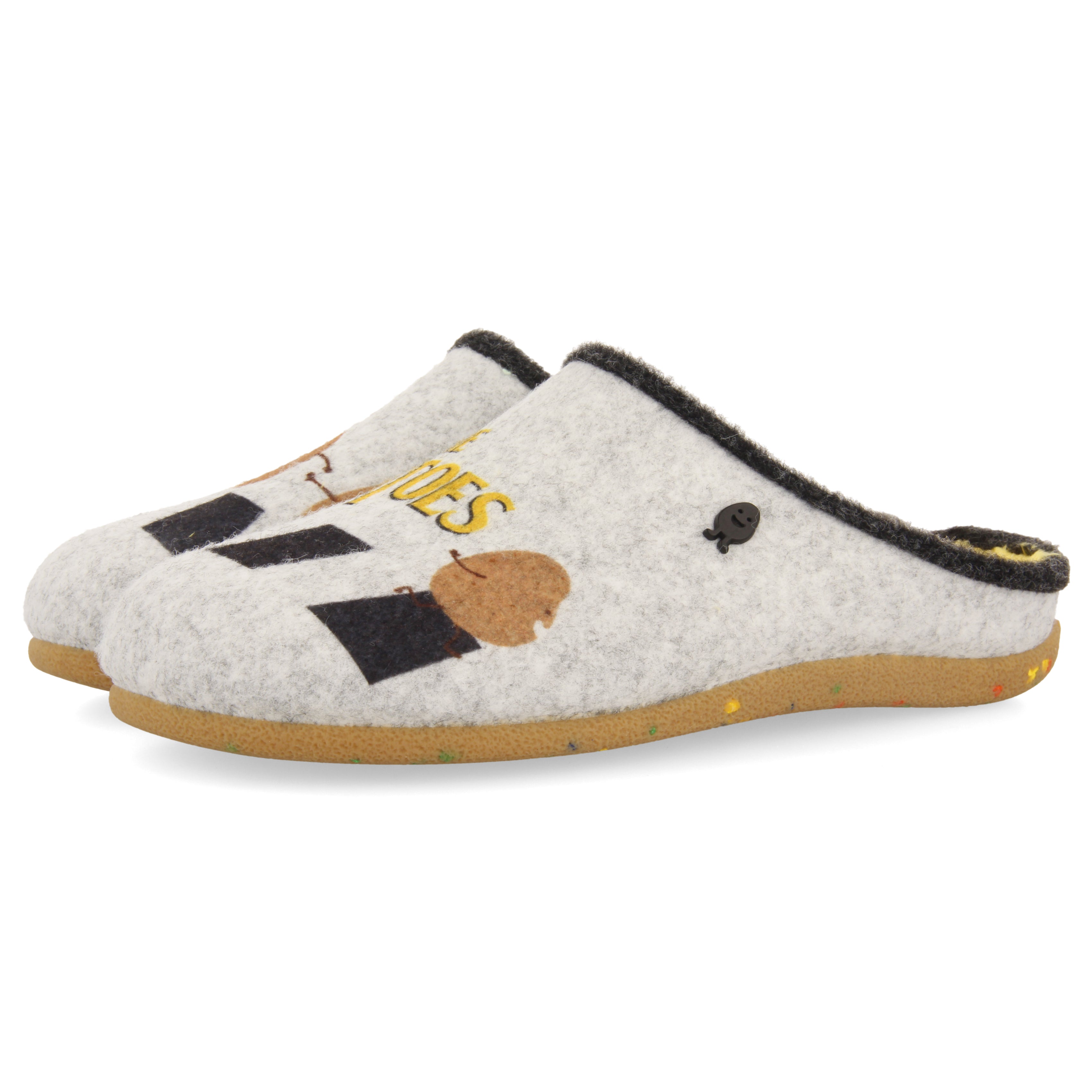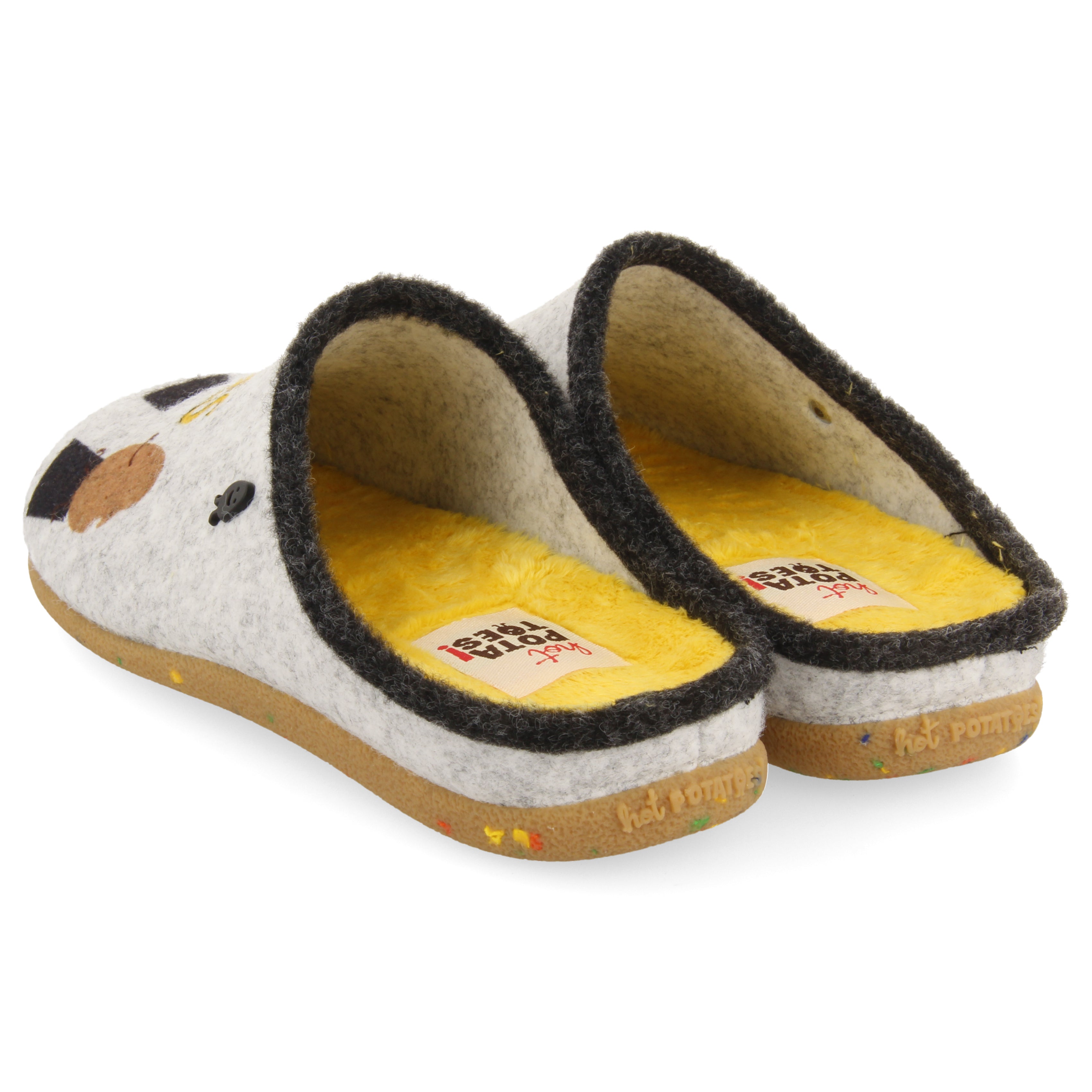 ¡Las zapas mas cómodas, divertidas y sostenibles son de Hot Potatoes! Zapatillas de estar por casa tipo babucha color gris .El corte es de fieltro PET. El ribete y la planta de pelo de material suave. La plantilla es extraíble de espuma de poliuretano 100% reciclado y la suela es de caucho natural en tono caramelo y con viruta de colores de goma EVA.