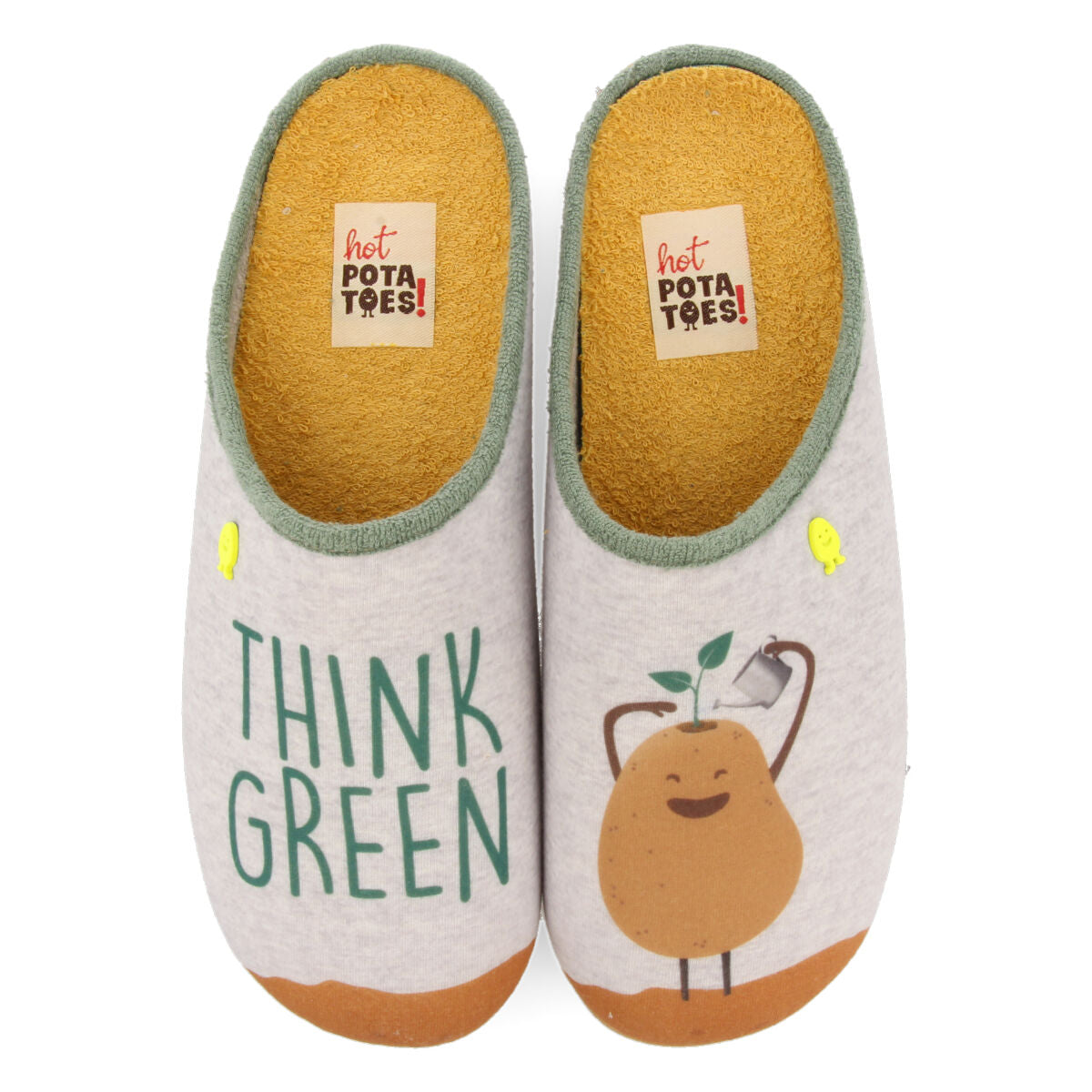 Las zapatillas de estar por casa que tienes que tener. Zapatilla de casa tipo babucha con corte estampado de jersey con mensaje Think Green, ribete y planta de rizo suave y transpirable con estampado de lunares. Plantilla extraíble de material reciclado y suena de goma natural en color caramelo con pintas multicolor. Forro transpirable. No te pierdas las zapatillas más divertidas, conforables y sostenibles con Hot Potatoes.